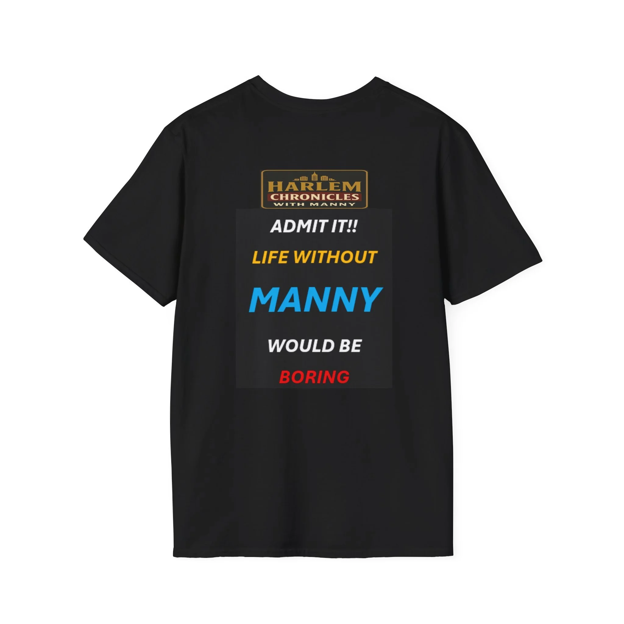 Walk the streets of Harlem with a dry smile and a knowing nod. This lightweight tee carries bold, stenciled lines that read like a character’s punchline — confident, cheeky, and rooted in community. The front declares allegiance (“I never question Manny’s choices—Because I’m one of them”), while the back delivers the wink (“Admit it! Life without Manny would be boring”). Worn alone or layered under a jacket, it’s a quiet badge for people who appreciate neighborhood legends, sharp humor, and stories that live in everyday moments.